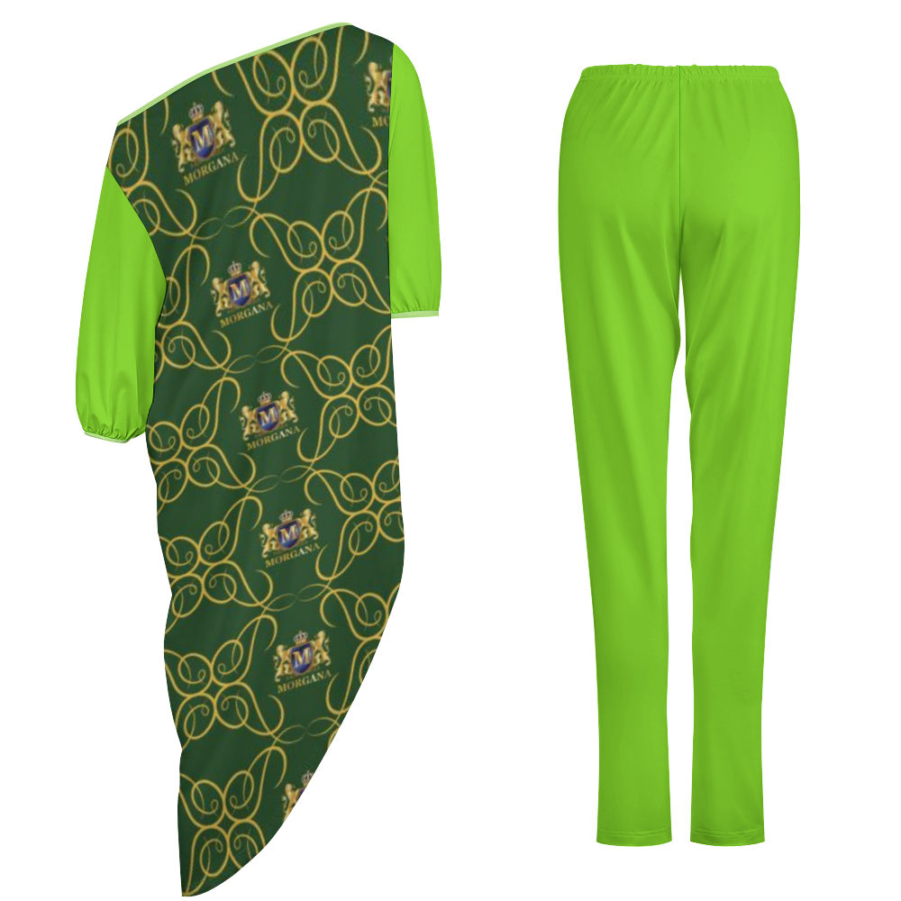 The outfit has a diagonal shoulder and half-sleeve design top, and a pair of high-waisted, adjustable long pants. The set is an elegant and sexy style that can make you look gorgeous and feminine, and the unique diagonal shoulder design of the top perfectly highlights your enchanting figure.